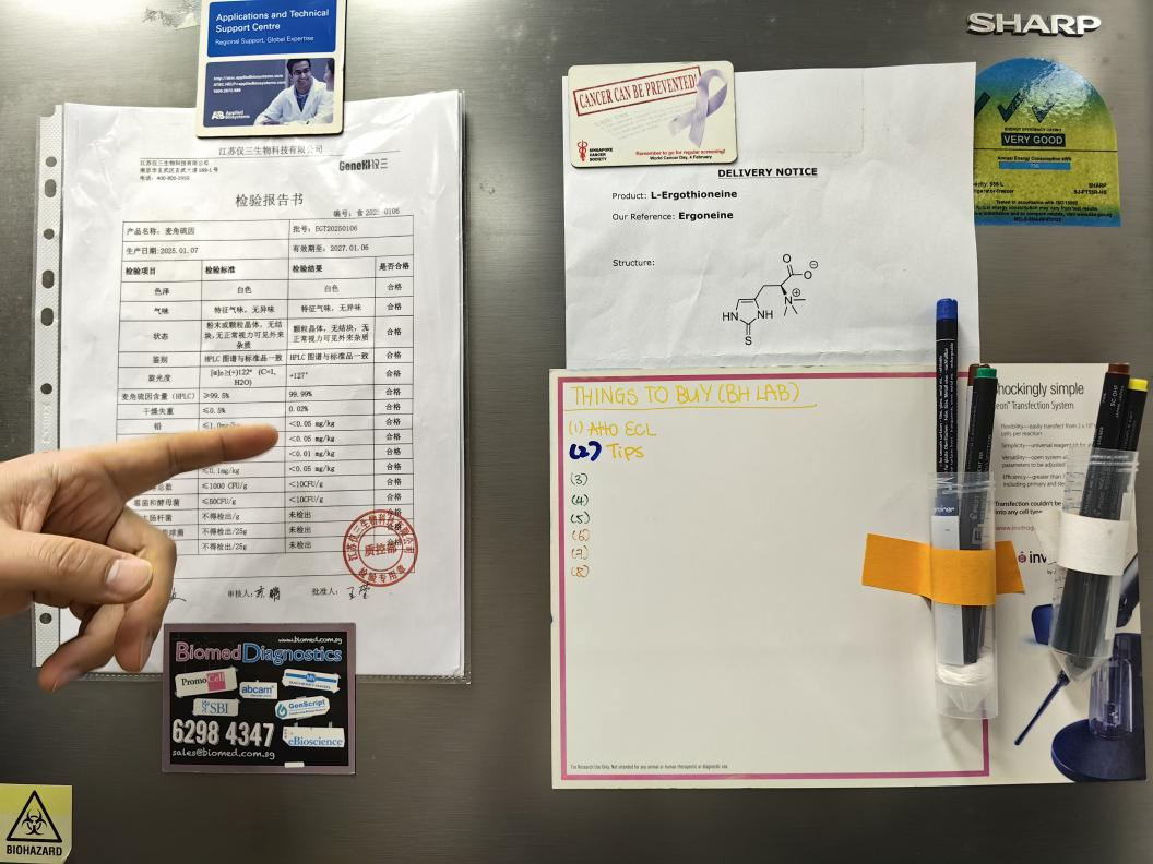 这个实验室属于Barry Halliwell教授和他的研究团队,过道旁的冰箱上,是这个研究团队的信息交互点,除了记一些重要事项,还有一份显眼的、中文打印的报告,上面是GeneIII仅三生物的麦角硫因检验报告书。