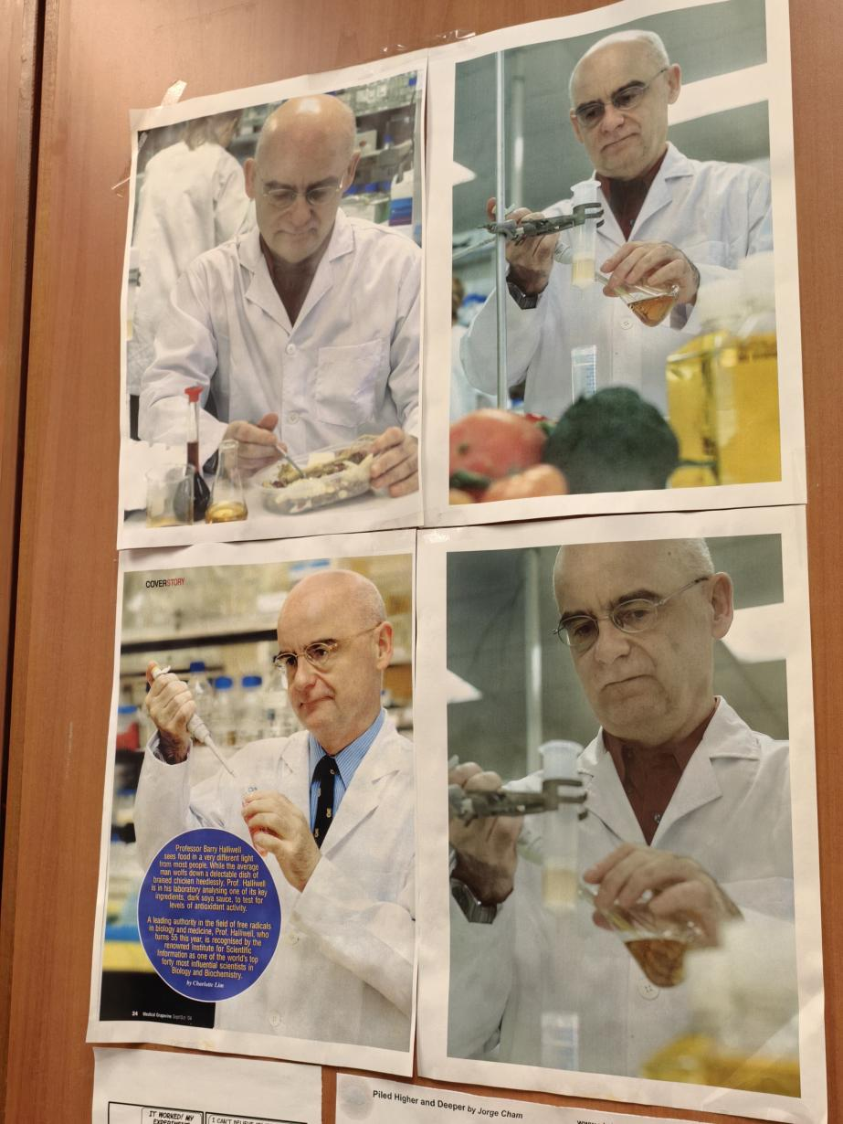实验室贴着20年前Halliwell教授的照片,今天他在新加坡国立大学所带领的科研团队,依旧在致力于探究疾病跟氧化损伤之间的关系,解决那些过去无从下手的病症。