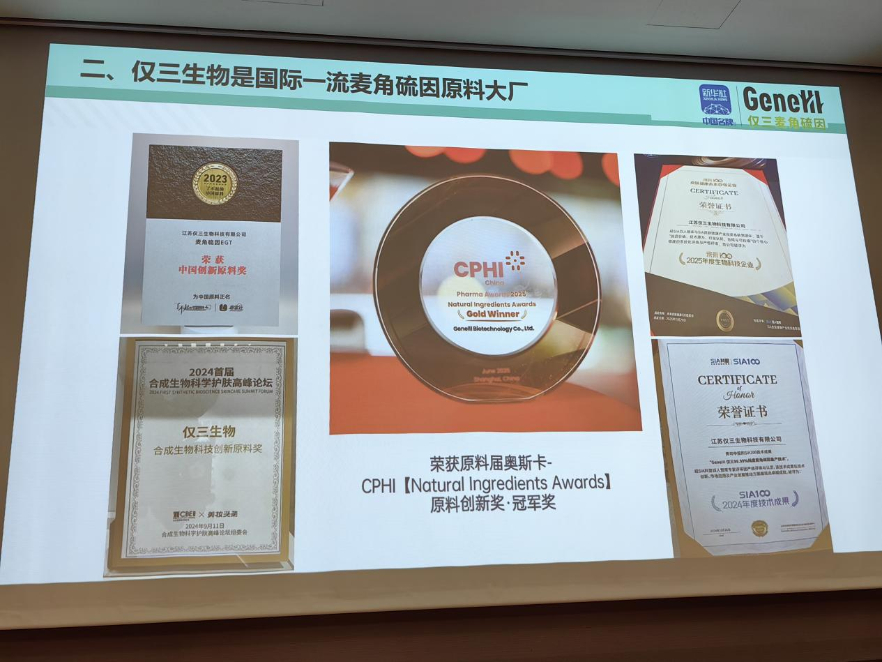 而且生物发酵的提取方式,得到的麦角硫因没有杂质残留,纯度可以到99.99%的制药级,是目前世界上纯度最高的麦角硫因,拿到了原料届奥斯卡CPHI的原料创新奖冠军,GeneIII仅三也得到了国家科技部跟工信部的高度认可。
