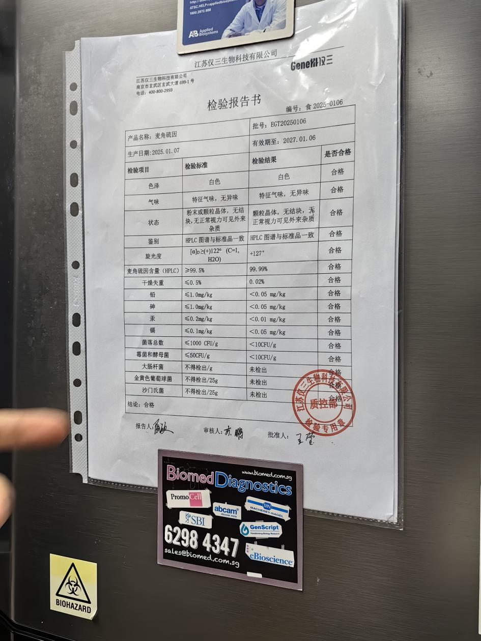 实验室冰箱上贴着的那份检验报告单,展示的是仅三生物的麦角硫因,当中微量元素的含量,以及99.99%的纯度。