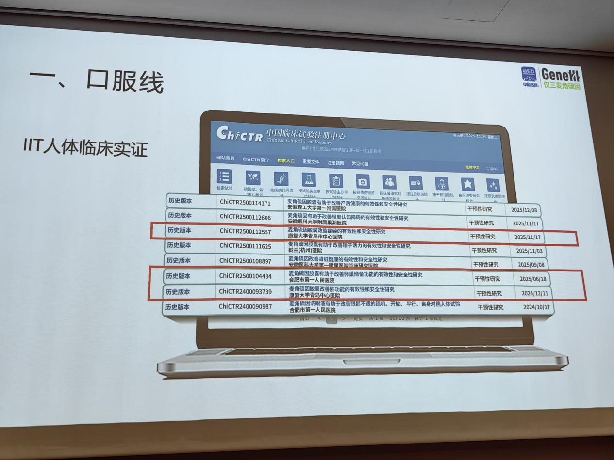 GeneIII仅三生物已完成的两项关键人体临床研究——麦角硫因对肝功能改善的有效性和安全性研究(国家官网备案号:ChiCTR2400093739),及对干眼症、视疲劳的缓解作用(国家官网备案号:ChiCTR2400090987)