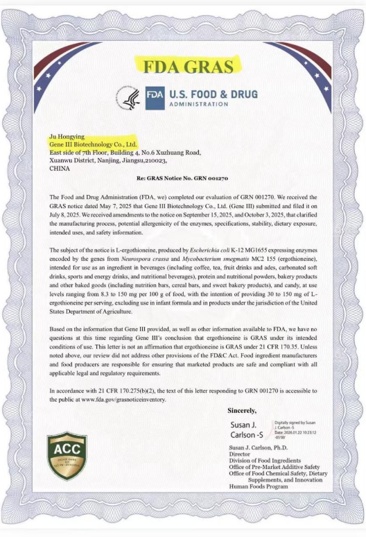 2026年,中国合成生物学产业正经历从“模式创新”向“硬核科技”的历史性迁徙。 在这一背景下,江苏仅三生物科技有限公司(以下简称“GeneIII仅三生物”)宣布了一项震撼全球的里程碑式进展:其生产的L-麦角硫因(L-ergothioneine)已正式获得美国食品药品监督管理局(FDA)的GRAS(一般认为安全)认证。这标志着中国合成生物学企业在全球高价值成分的研发与国际合规化进程中,成功夺得了极具含金量的“全球通行证”。